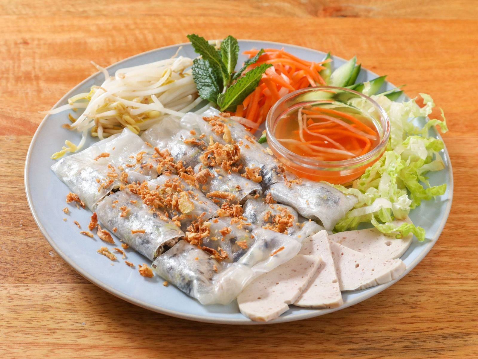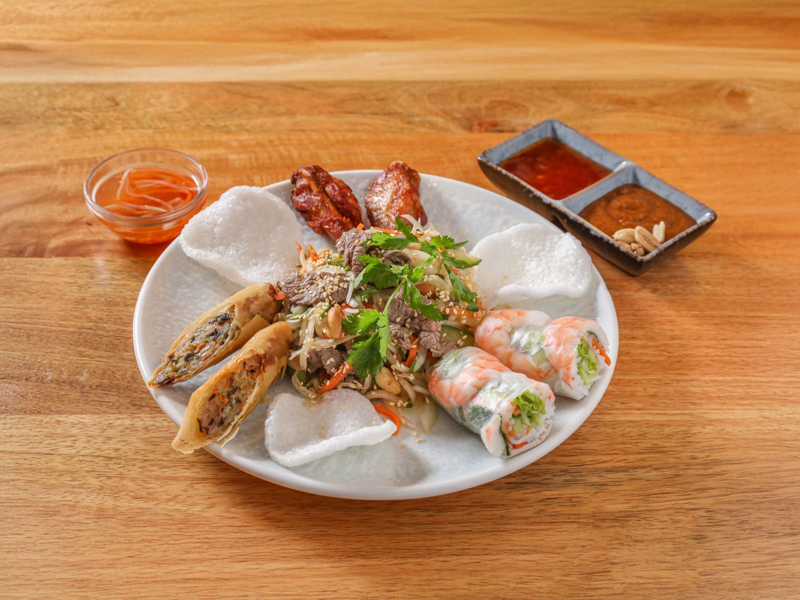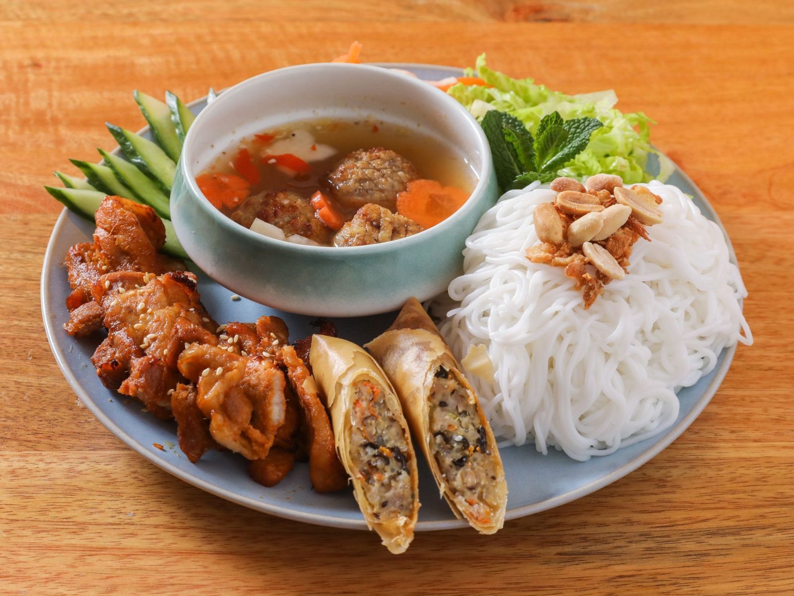14.50€Fideo de arroz, carne de cerdo a la parrilla, rollitos de primavera, limoncillo, zanahoria, lechuga, hierbas, pepinos,